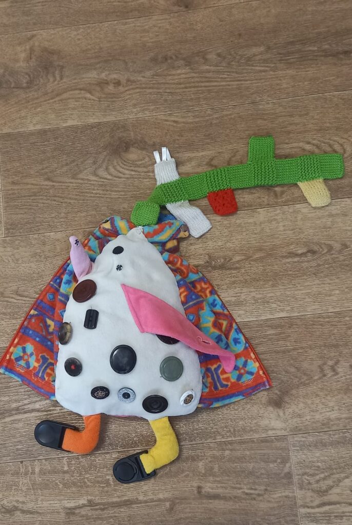 Mērķi. Apgūt dažādas aizdares tehnikas, sīkās motorikas treniņš, kustību koordinācija, acs-rokas koordinācija, pacietības, izturības, koncentrēšanās, gribasspēka treniņš. Nepieciešamie materiāli. Audums, pildījums spilvenam, pogas, spiedpogas, sprādze,