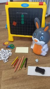 Mērķis: Attīstīt pareizu skaņas izrunu, iepazīt skaņai atbilstošo simbolu, redzes uztveri, redzes atmiņu, gatavošanās rakstīšanai (pirkstu treniņš rakstāmlietas turēšanai), spēja vizuāli atšķirt krāsas. Nepieciešamie materiāli: Laminēti