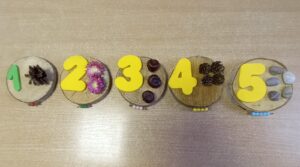 Mērķis.Palīdzēt apgūt skaitīšanu no 1 līdz 5. Sasaistīt kvantitāti ar simbolu, ieviest simbolu secīgumu. Mācīties no galvas secīgu skaitļu rindu. Nepieciešamie materiāli.Koka ripas, putuplasta cipari,