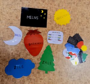 Mērķis.Spēt vizuāli atšķirt krāsas. Veidot izpratni par krāsu dažādību. Attīstīt acs-rokas koordināciju. Trenēt sīko motoriku. Nepieciešamie materiāli.Laminētas krāsu kartiņas: lielās – viens eksemplārs, mazās- tik