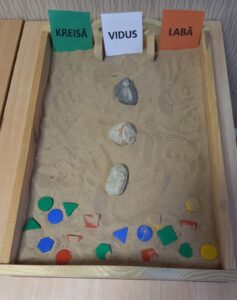 Mērķis: attīstīt lasītprasmi, redzes uztveri, veicināt sensoro maņu- redzes, taustes, dzirdes attīstību, kas pozitīvi emocionāli ietekmē bērnu. Nepieciešamie materiāli: kaste, smiltis, akmentiņi ar burtiem. Norise: