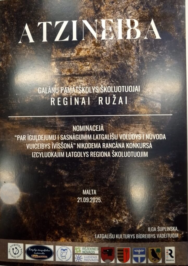 Gaļānu pamatškolys školuotuoja Regīna Ruža sajēme atzineibu nominacejā “Par īguļdejumu un sasnāgumim latgalīšu volūdys i nūvoda vuiceibys īvīsšonā”! ![]()